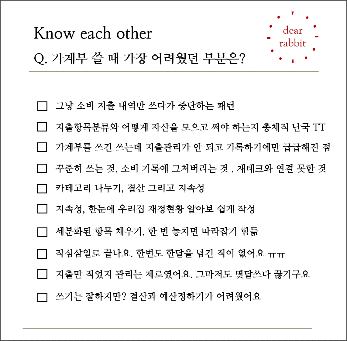 1. 피드에 올린 이미지는 디어래빗 웰컴 메일 설문 내용 몇 개 추린 겁니다. 엑셀 쭉 보면서 내 예상이 맞았다며 무릎을 탁 쳤네요. 대부분 사람들이 지출 통제를 위해 가계부를 쓰는 게 아니라 자산관리를 하고 싶었다는 거. 여태 카테고리별 소비지출 쓰느라 너무 지치신 게 여실히 설문에서 드러났어요. 현재까지 디어래빗 구매자는 30대 60%, 40대 35%, 기타 5%구요. 남성 비율도 20%수준입니다. 가계부 쓰는 남성분들 넘 멋지네요. 12월 초에 설문 최종 마감하면 통계 오픈 할게요.