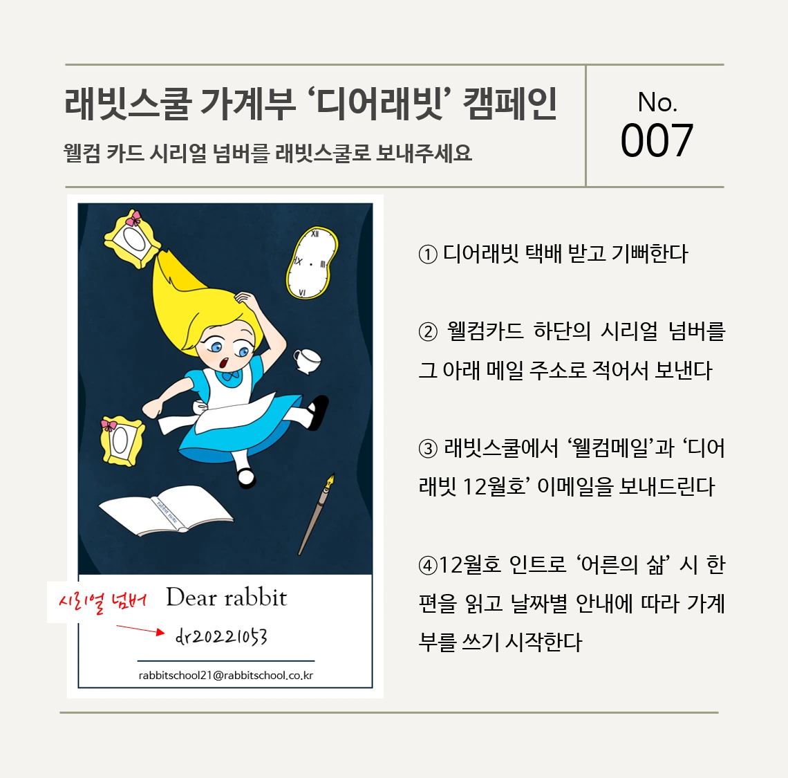 긴급 공지드립니다. 가계부 수령 후 아직 웰컴카드에 적힌 시리얼 넘버를 안 보내주셔서 저희가 디어래빗12월호 발송을 못해드리는 분이 많아요.