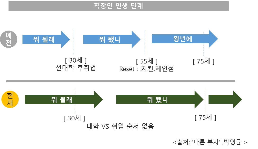 나는 시간을 돈으로 바꾸는 급여 생활자였다. 번듯한 명함이 나의 존재 가치를 밝혀 주긴 했지만, 나이와 건강 때문에 정년까지 일하기도 무리인 것이 바로 직장인이다. 큰 그림을 먼저 살펴보자. 직장인의 인생 단계를 예전과 비교하여 보겠다.