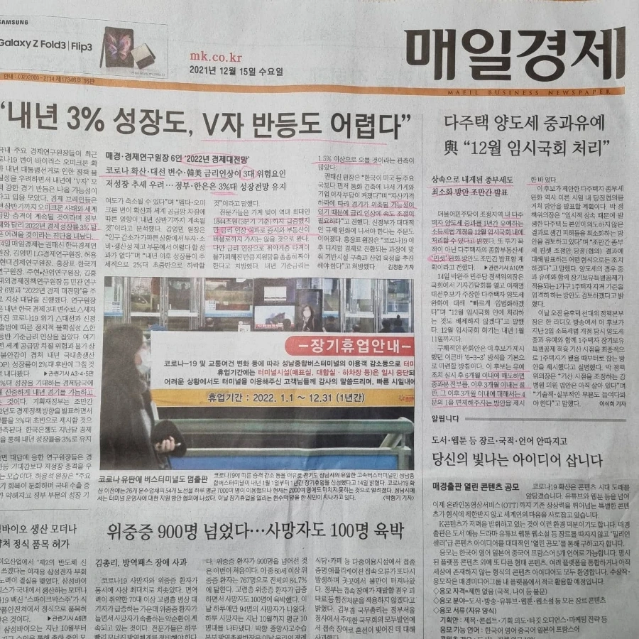 2. 증권가 리서치 센터장 6인의 말도 들어보자. 여기도 3가지 조심하라 한다. 코로나· 금리 인상· 공급망 타격. 내년도 코스피는 2800~3400 박스피에 머물 거라는 예측이 지배적이었다. A5면 표에 6인의 의견이 잘 정리되어 있으니 보자. 유망업종으로는 반도체· 2차전지·플랫폼·메타버스· 유통· 항공· 바이오... 등 없는 게 없다. 여기서도 어디 보자. 내 픽은 KB증권 신동준 센터장이다. 유망업종으로 콘텐츠와 바이오를, 증시 변수로는 중국과 미국을 동시에 봤고 유망종목으로는 하이브를 찍었다. 가장 심플해서 이 분을 꼽음. 뭐, 내 의견이 중요한 건 아니다.
