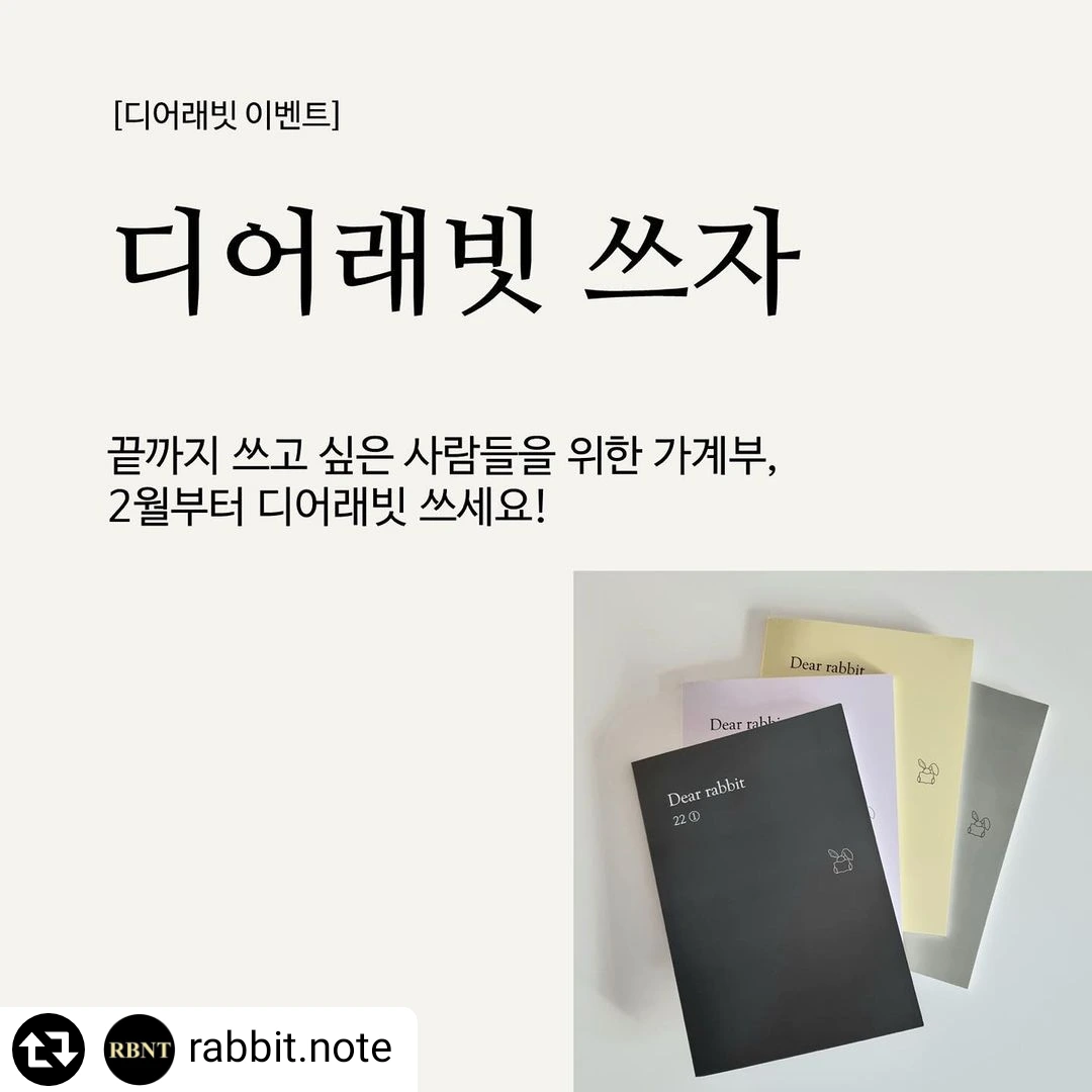 2022년 계획 중 하나로 일상 재테크의 기본 가계부 쓰기 어떠세요?디어래빗 가계부와 함께 가계부 쓰는 재미를 느껴보세요! 수입 지출 맞추다 스트레스 받는 가계부가 아닌…쓰기 쉬운 구성에 때론 다이어리처럼, 일기장처럼.. 자유롭게 쓸수 있는 디어래빗으로 가계부 쓰기 시작해보세요!