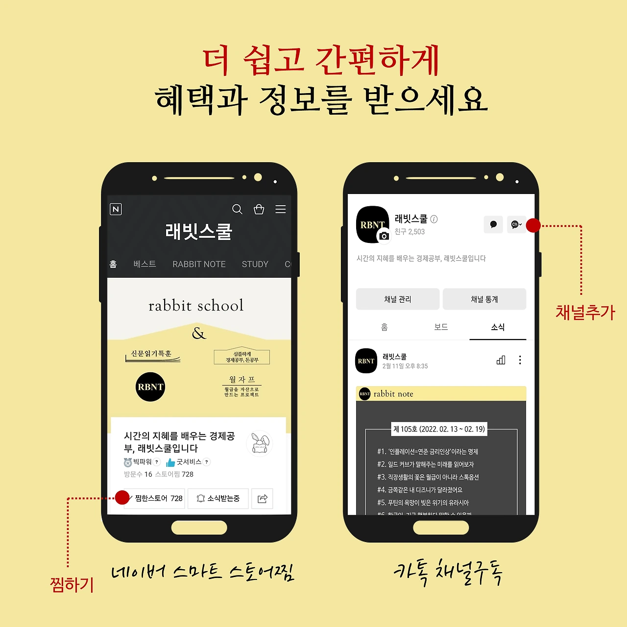 래빗스쿨이 좀 더 가까이 다가갑니다. 쿠폰 혜택과 구독 안내를 받으시려면 꼭 네이버 스토어찜과 카톡채널 등록을 해주세요. 더 쉽고 간편하게 래빗스쿨을 이용하실 수 있답니다.
