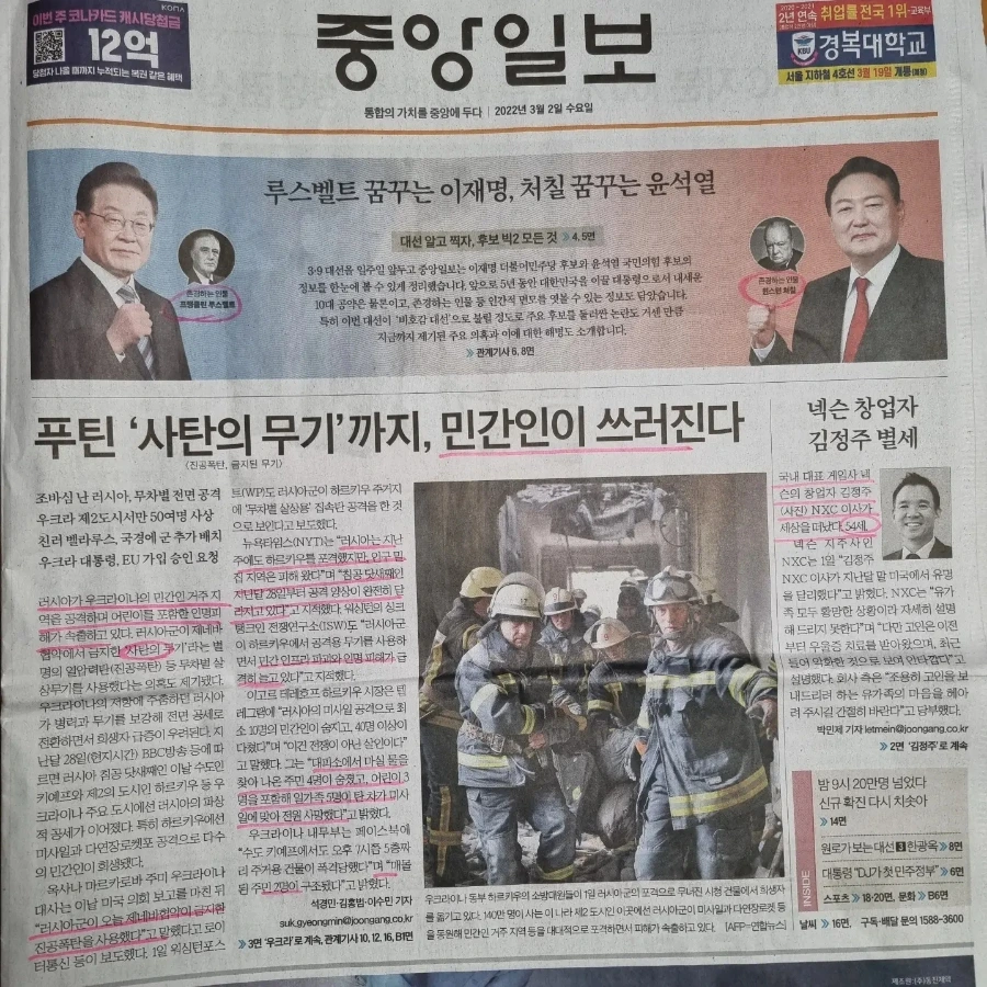 5. (매경)한국은 절대 망하지 않는다는 이진우 국차장 겸 지식부장의 칼럼을 보자. '기자 생활을 하면서 체득한 확신'이라는 문구로 애국심을 고취하려는 듯 보이나, 확신만큼 위험한 것도 없다는 것을 누구보다 잘 아실 듯 하다. 세상은 쉽게 변하고 오늘 내 생각도 내일 틀릴 수 있을 정도로 변동성이 강한 요즘이다. 푸틴 대통령은 쉽게 정복할 수 있을 거라 여겼던 오크라이나에서 고전 중이고, 유럽과 미국은 참전은 하지 않으니 도움이 되겠냐 했지만 강력한 경제 제재를 잇달아 내놓으면서 러시아 경제를 붕괴 위기로 몰아넣고 있고, 스위스는 중립국이라 중립할 줄 알았는데 의사결정권자들의 재산을 볼모로 잡아 정신 사납게 만들어버렸다. 궁지에 몰리는 러시아가 핵이라도 쓰게 되면 우리는 다 망하는 것이고, 그 전에 끝난다면 평화가 찾아오겠지. 대선이 남아 있지만 무엇도 속단할 수 없는 요즘이다. 함부로 주가의 등하락에 베팅하는 실수를 하지 않는 게 좋겠다.