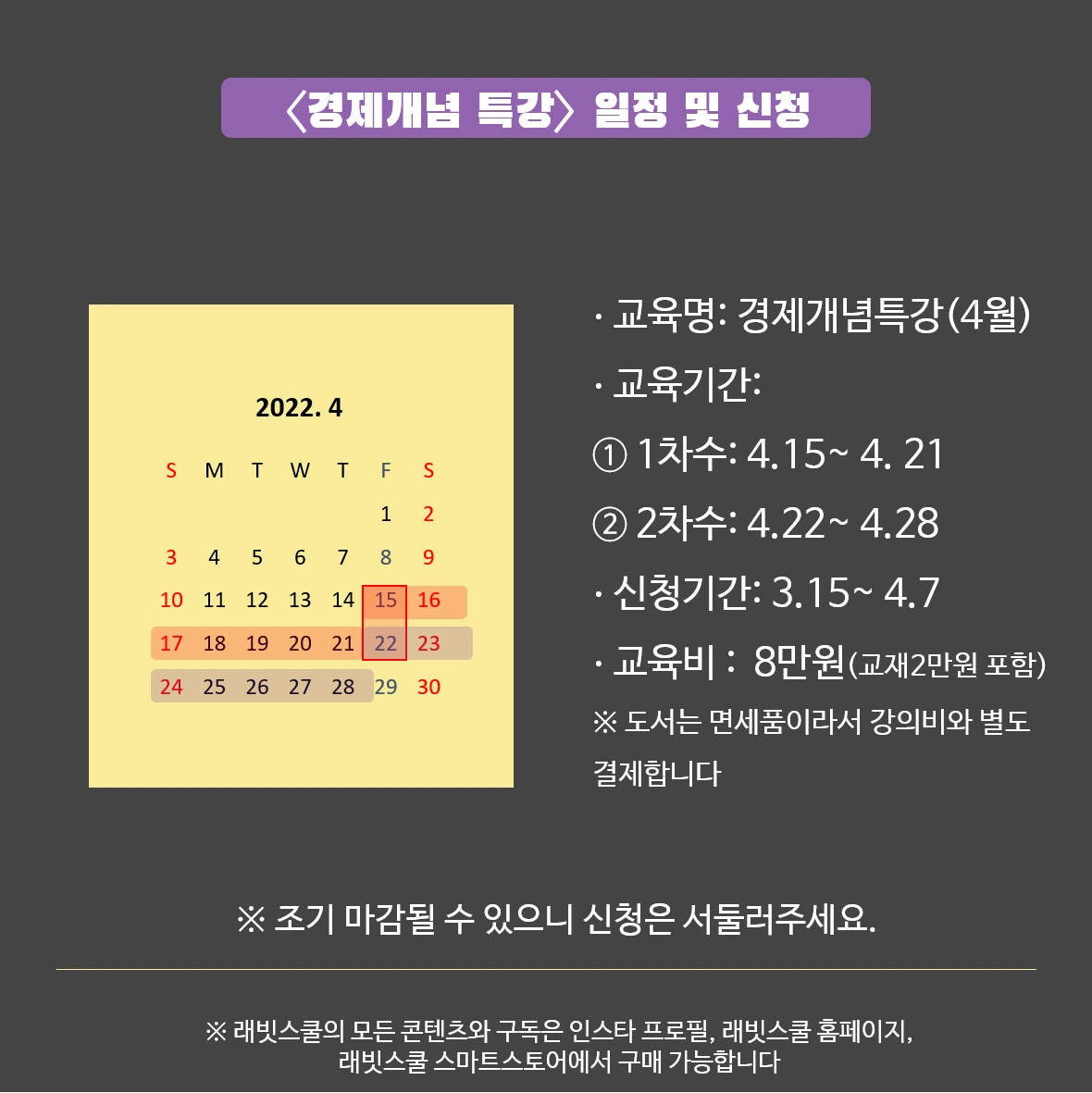 강의비와 교재비는 별도 결제입니다. 도서는 면세품목이기 때문에 번거롭지만 강의비(6만원)과 교재비(2만원)을 따로 결제 바랍니다. 세트로 구매하셔야만 본 프로그램 에 참여하실 수 있습니다.