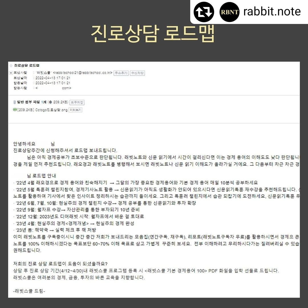 안녕하세요. 래빗스쿨 진로상담 신청해주셔서 감사합니다. 상담신청서에 경제공부 수준, 목표, 가족 구성등을 작성해주시면 자세한 상담과 함께 래빗스쿨 프로그램을 컨설팅해드립니다. 상담