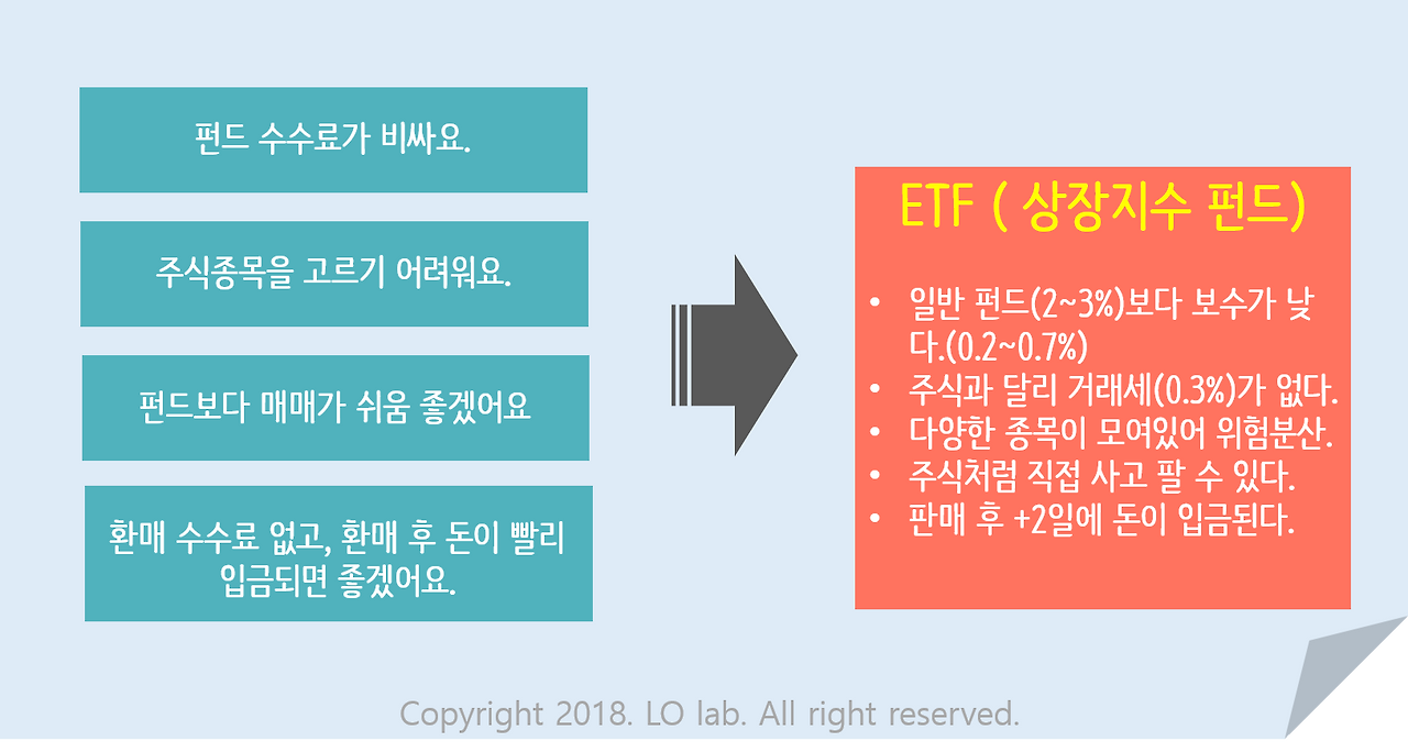 금융 상품도 다를 바 없다. 금융사는 투자자의 마음을 읽어보고 그에 맞는 상품을 계속 개발해낸다. ETF도 그러한 대박 난 금융 상품 중 하나이다. 개별 주식의 장점인 쉽고 빠른 매매 방식을 펀드의 장점인 분산투자와 결합하였다. 게다가 펀드매니저의 운용보수를 줄이고 세금에 대한 혜택은 추가하였다.