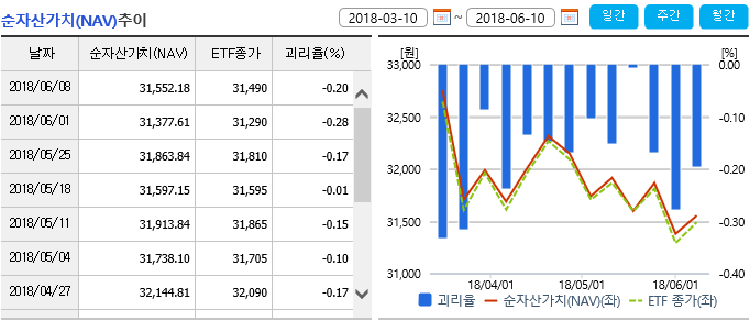 NAV는 ETF총자산과 부채, 그리고 보수 등의 모든 비용을 제한 값을 의미하고 CU(Credit Unit)의 기본 가격이다. 그렇기 때문에 시장가가 NAV보다 저렴하다면 저평가, 높다면 고평가라 볼 수 있다. 그 비율적 차이를 괴리율이라 부른다. 괴리율 차이가 많이 생기지 않도록 LP(Liquidity Provider, 유동성 공급자)들이 호가를 내어 가격을 조정한다. 괴리율이 적을수록 LP의 역할을 잘 하고 있고 신뢰성이 높다는 뜻이다.