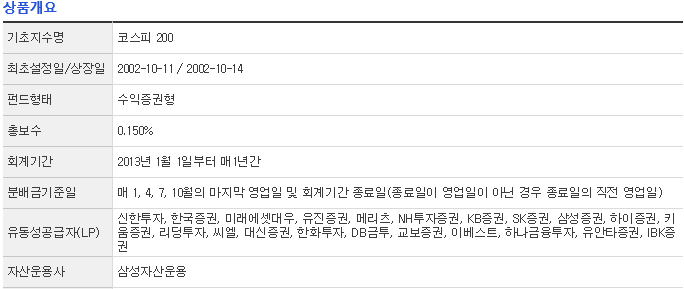 금융 용어는 약어가 많고 평상시에 잘 쓰지 않기 때문에 다소 생소하게 느껴진다. 그러나 중요한 포인트만 기억하고 있으면 상품을 이해하는데 도움이 된다. 그래서 우리나라 ETF 중 가장 오래됐고(2002년 설정) 거래 규모가 가장 큰 KODEX200의 분석자료를 바탕으로 간단히 용어 설명을 해보려 한다.