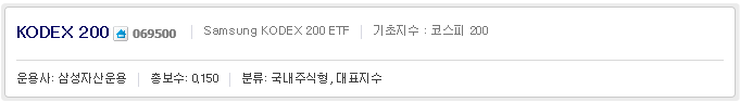KODEX200은 KOSPI의 상위 200 종목의 지수를 추종하는 ETF이다. 'KODEX'는 삼성자산운용의 ETF 브랜드명이고 'TIGER'는 미래에셋자산운용의 브랜드를 의미한다. 총보수는 연간 0.15%이며 NAV(Net Asset Value, 순자산가치)에 미리 계산되어 반영된다.