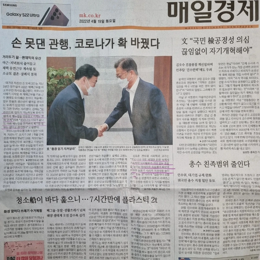 3. (매경) 거리두기 해제됐지만 코로나가 일깨운 5가지에 대해 매경에서 정리했다. 1) 결혼식 등 경조사 간소화 ← 하객 인원수 제한과 해외여행 금지가 자연스럽게 결혼을 간소화게 만들었다. 2) '대목 규제' 원격진료 허용 ← 코로나 재택 치료로 전화만으로도 진료와 처방이 가능해서 환자는 편리했고, 병원은 거리가 먼 환자고객 유치에 신경이 쓰이는 분위기였다. 3) 근무 방식의 다양화 ← 재택과 출근의 하이브리드 시대 4) 마스크 착용· 손씻기 생활화 ← 일상 속 위생이 중요해졌고, 덩달아 일상 필수품이 된 손소독제 시장의 고급화가 생겨났다. 5) 눈치 보지 않고 정시 퇴근 ← 공식적인 회식이 줄어 집에 귀가하는 시간이 빨라졌다고.