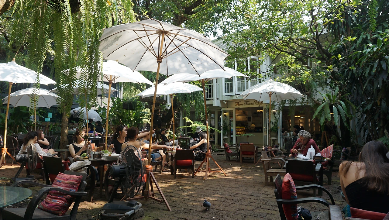 이미 야외 테이블 대부분은 손님들로 가득한 와중에 마당 한 귀퉁이에 비어 있는 낮고 편한 나무 테이블에 앉았다. 울창한 숲 속처럼 새소리가 울려 퍼진다 싶었는데 마당을 거닐고 있는 새가 여러 마리, 나뭇가지 위에는 새 둥지도 보였다.