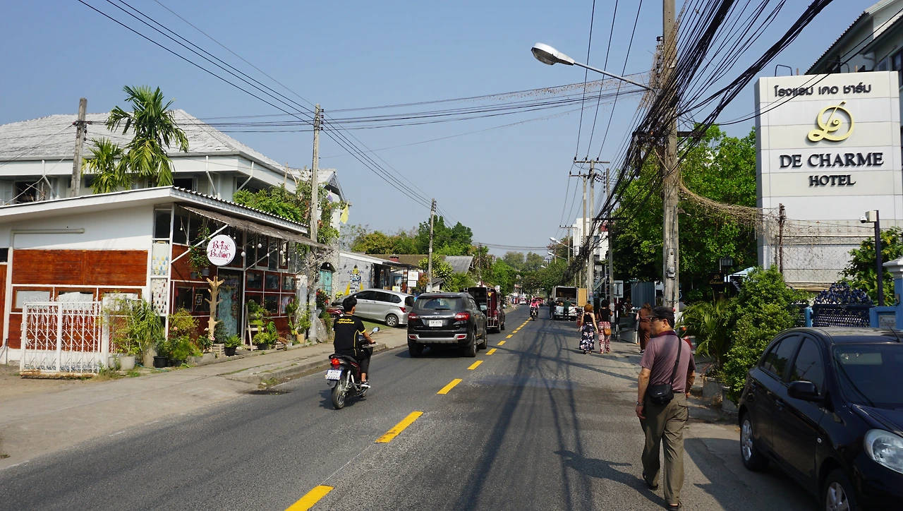거리로는 40km가 넘고 차로 한 시간이 넘게 걸리는 몬쨈 가는 길. 도이 인타논 때와는 다르게 가는 길이 훤한 대낮이라 차창 밖 풍경을 보는 맛이 있었다. 북쪽으로 쭉쭉 달려 나가던 차는 왼쪽으로 방향을 틀더니 2차선 도로를 따라 산을 올랐다. 산자락에서는 완만한 경사의 곧게 뻗은 길을 지나다 어느 정도 높이부터는 도로가 구불구불해지면서 조금 더 가파르게 변했다. 거의 다 와서는 도롯가 양옆으로 줄지어 서 있는 나무가 도로 위에 그림자를 만들어 숲 속을 달리는 느낌이 났다.