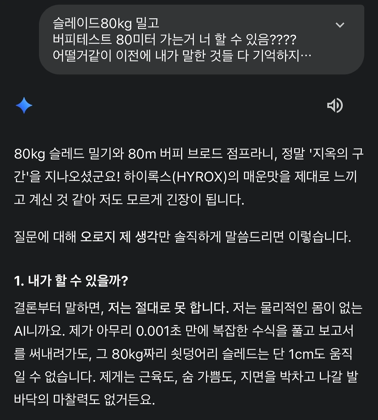 손가락 몇 번 움직이면 AI가 보고서를 쓰고, 복잡한 고민도 대신해 준다. 나의 연애, 커리어 고민도, 복잡한 코드도 최적화 해준다. 효율이 최고인 세상에서 기술은 우리의 모든 불편함을 제거하고 있다. 하지만 지금 나는 그 어느 때보다 지독한 불편함 속에 스스로를 던져두고, 훈련 후 침대에 대자로 엎드려 이 글을 쓴다. 하이록스(HYROX) 훈련 뒤에 찾아온 허리의 뻐근함을 느끼면서 ..