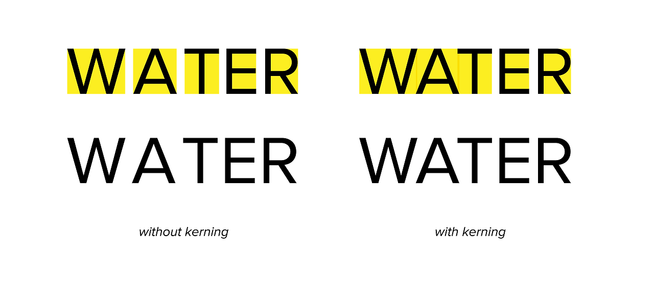 위의 예시에서 노란색 영역은 글자가 가지고 있는 고유한 넓이입니다. 왼쪽과 같이 글자를 기계적으로 배치하였을 때 간격이 매우 어색하지요. 하지만 오른쪽처럼 수동으로 글자 사이를 좁혀 커닝을 하면 훨씬 자연스러워집니다.