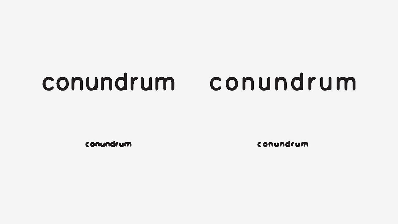폰트는 특정한 크기로 사용될 것을 상정하고 디자인*됩니다. (또는, 그래야 합니다.) 그리고 작게 쓰일 글자를 그릴 때에는 획 대비를 줄이는 것이 좋아요. 다른 방법도 있었겠지만, 우리는 빠르고 치사한 해결책을 찾고 있었으니까요.