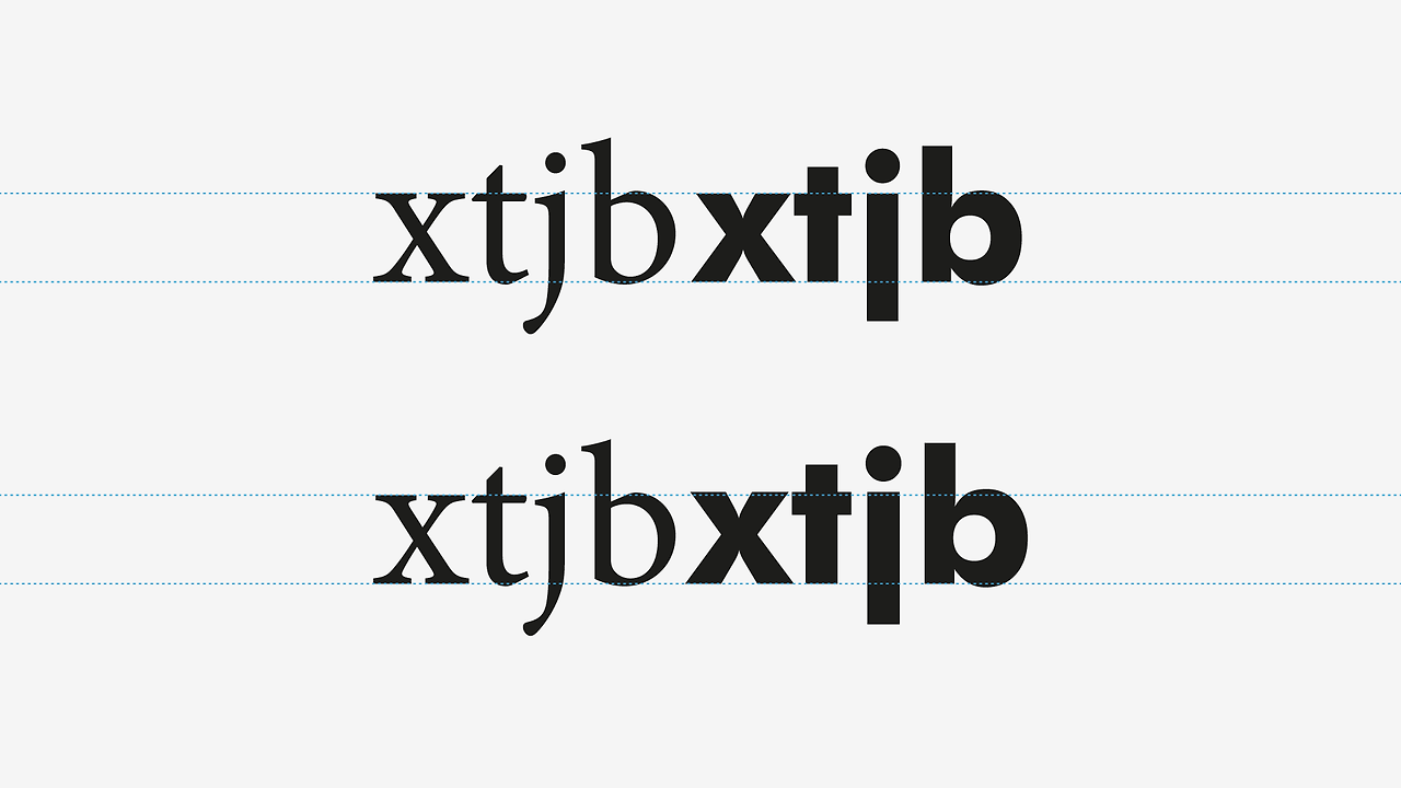 마찬가지로, 각기 다른 두께의 글자를 페어링 할 때에는, 굵은 획의 글자가 약간 커져야 해야 해요.