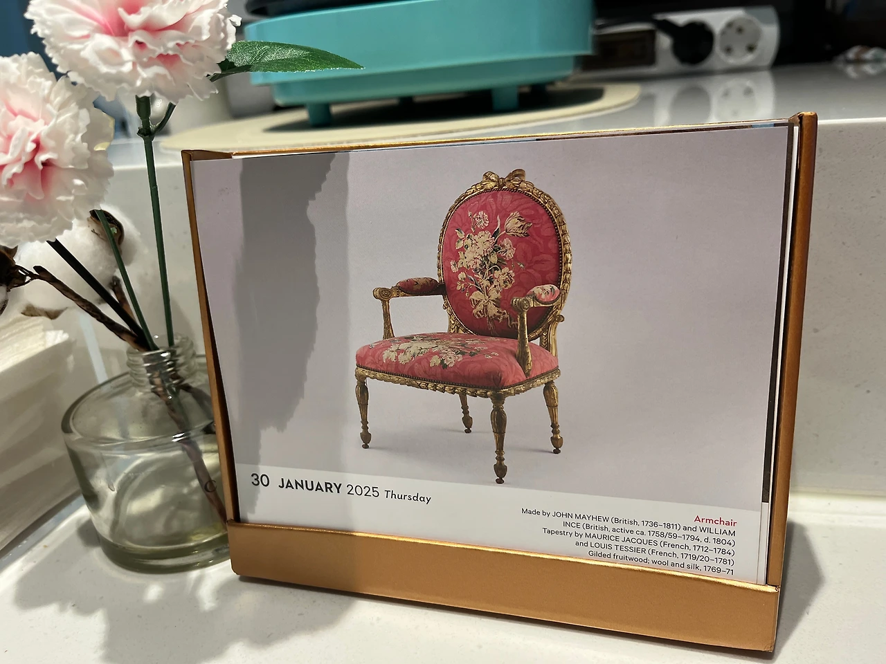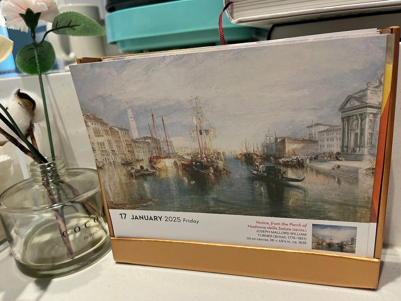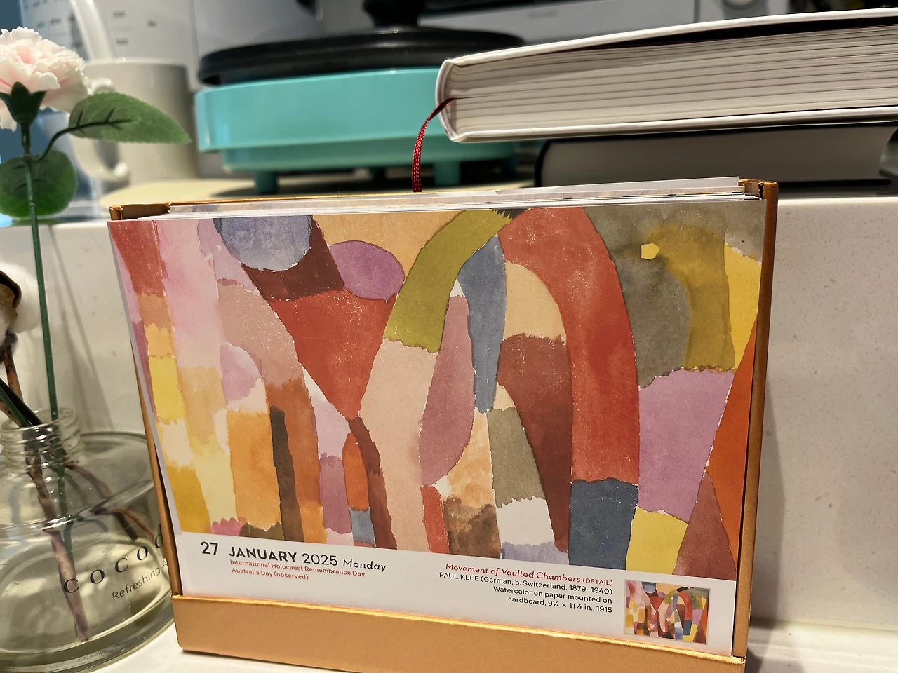 이 달력은 집에서 글을 쓰고 있는 책상 겸 식탁에서 오른쪽으로 눈을 돌리면 언제든 볼 수 있는 나만의 자리에 딱 위치를 잡고 있다. 아침에 일어나 커피 한잔을 내리고, 자리에 앉아서 오늘 날자의 작품을 넘긴다.