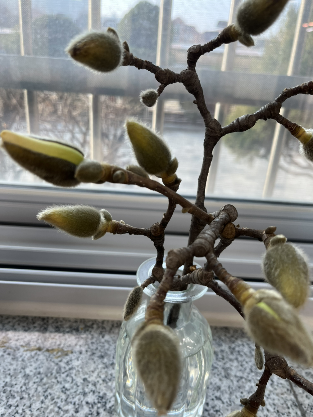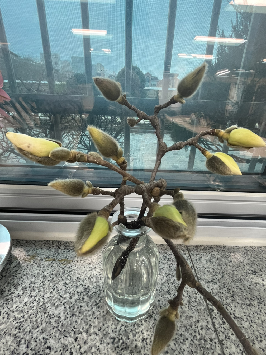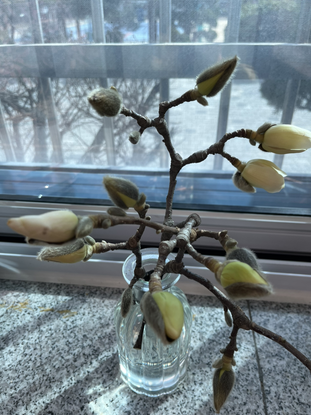솜털로 덮인 꼬치 안에서 꽃이 숨어 있었다. 그 안에 꽃이 곧 필 것이라는 것을 알지 못하면, 마치 누에고치와 같은 곤충과 같다고 생각할 것이다. 숨어 있는 꽃망울을 날마다 창가 물병에 꽃아 두고, 관찰했다. 꽃망울이 조금씩 부풀어 오른다는 느낌이 들었고, 어느 날 살짝 열렸다. 바깥을 싸고 있던 갈색 껍질은 툭 떨어지고, 꽃망울이 터졌다. 시간마다 들여다보니, 그때마다 꽃이 서서히 열리고 있다.