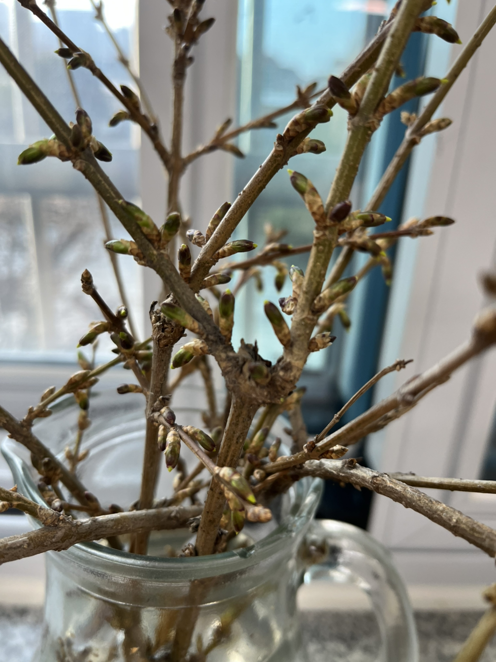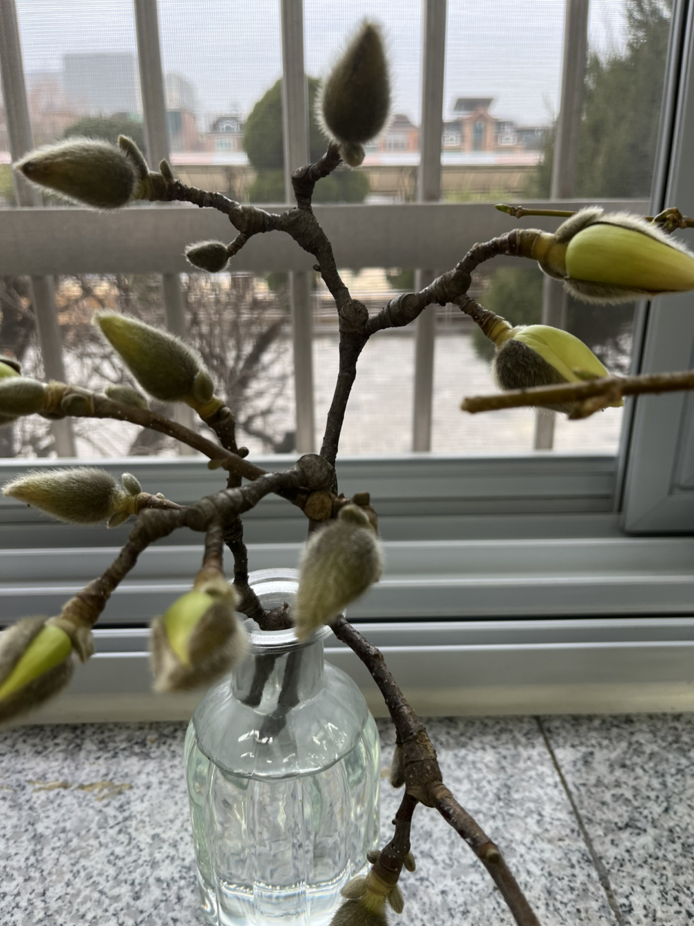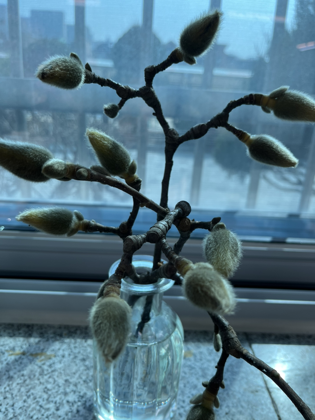 솜털로 덮인 꼬치 안에서 꽃이 숨어 있었다. 그 안에 꽃이 곧 필 것이라는 것을 알지 못하면, 마치 누에고치와 같은 곤충과 같다고 생각할 것이다. 숨어 있는 꽃망울을 날마다 창가 물병에 꽃아 두고, 관찰했다. 꽃망울이 조금씩 부풀어 오른다는 느낌이 들었고, 어느 날 살짝 열렸다. 바깥을 싸고 있던 갈색 껍질은 툭 떨어지고, 꽃망울이 터졌다. 시간마다 들여다보니, 그때마다 꽃이 서서히 열리고 있다.