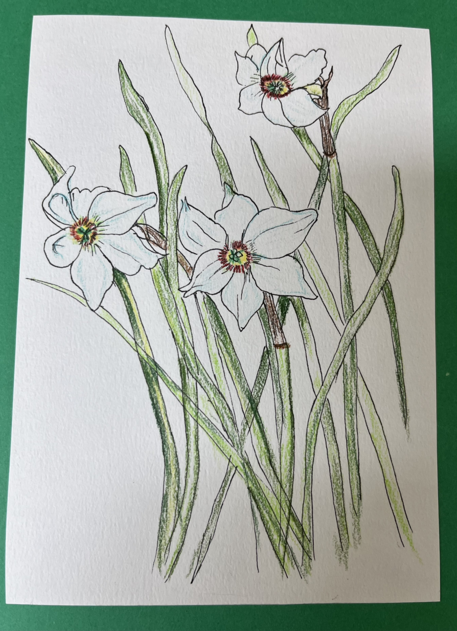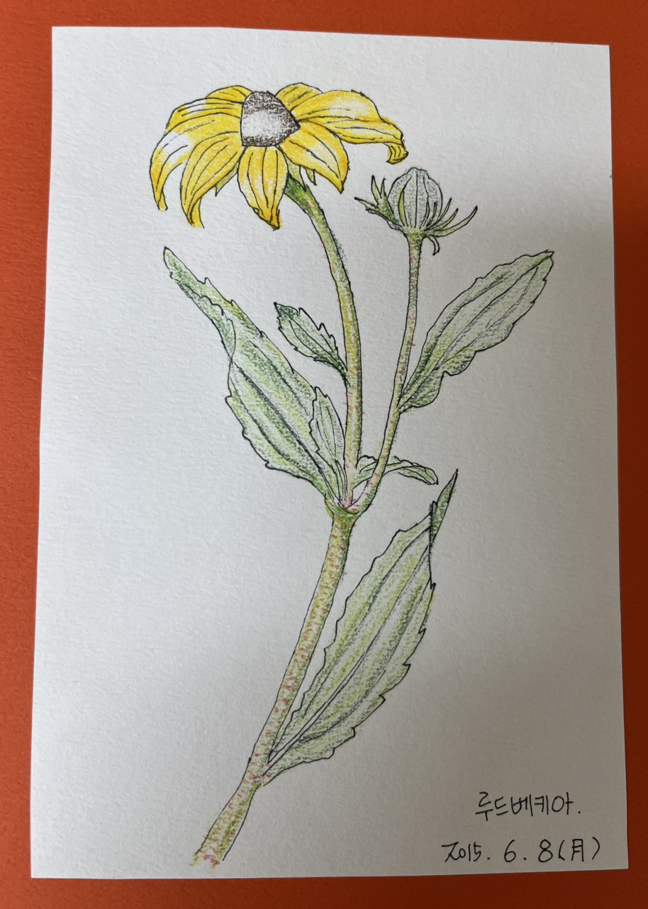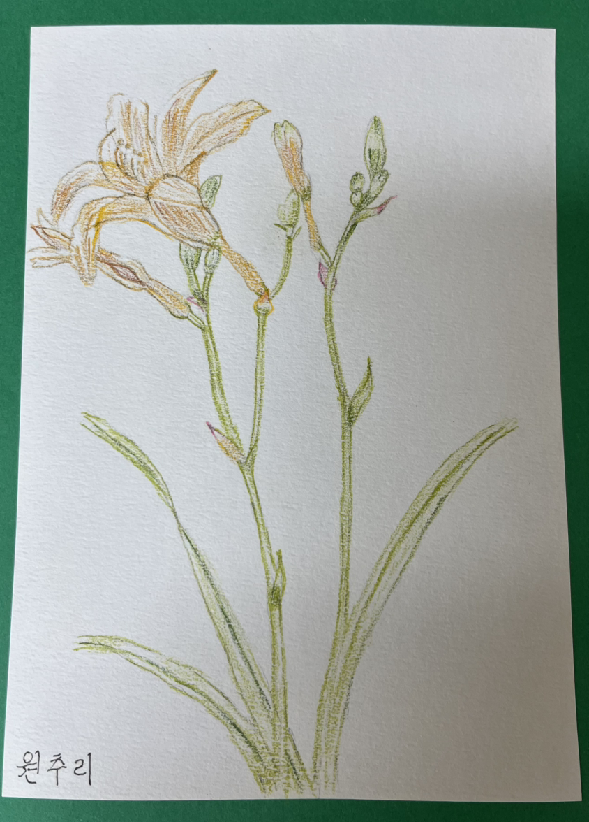 너무 예쁜데, 어떻게 표현할 말이 없다. 줄기, 꽃눈, 꽃이 벌어지기 직전의 모습, 노란 꽃잎, 꽃수술, 꽃잎의 모양.. 어떤 단어로도 묘사할 수 없는 꽃을 색연필로 그려보기로 했다. '못 그려도 괜찮아. 자세히보고 싶고, 색칠을 하고 싶으니까..' 나를 자유롭게 하는 주문을 걸었다.