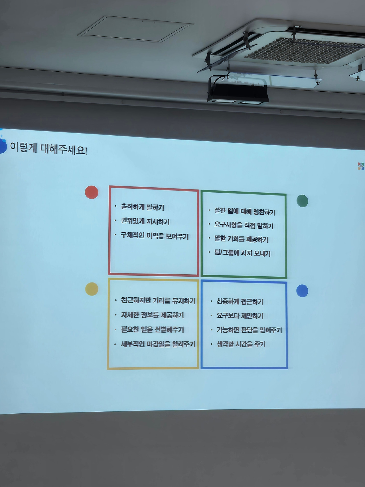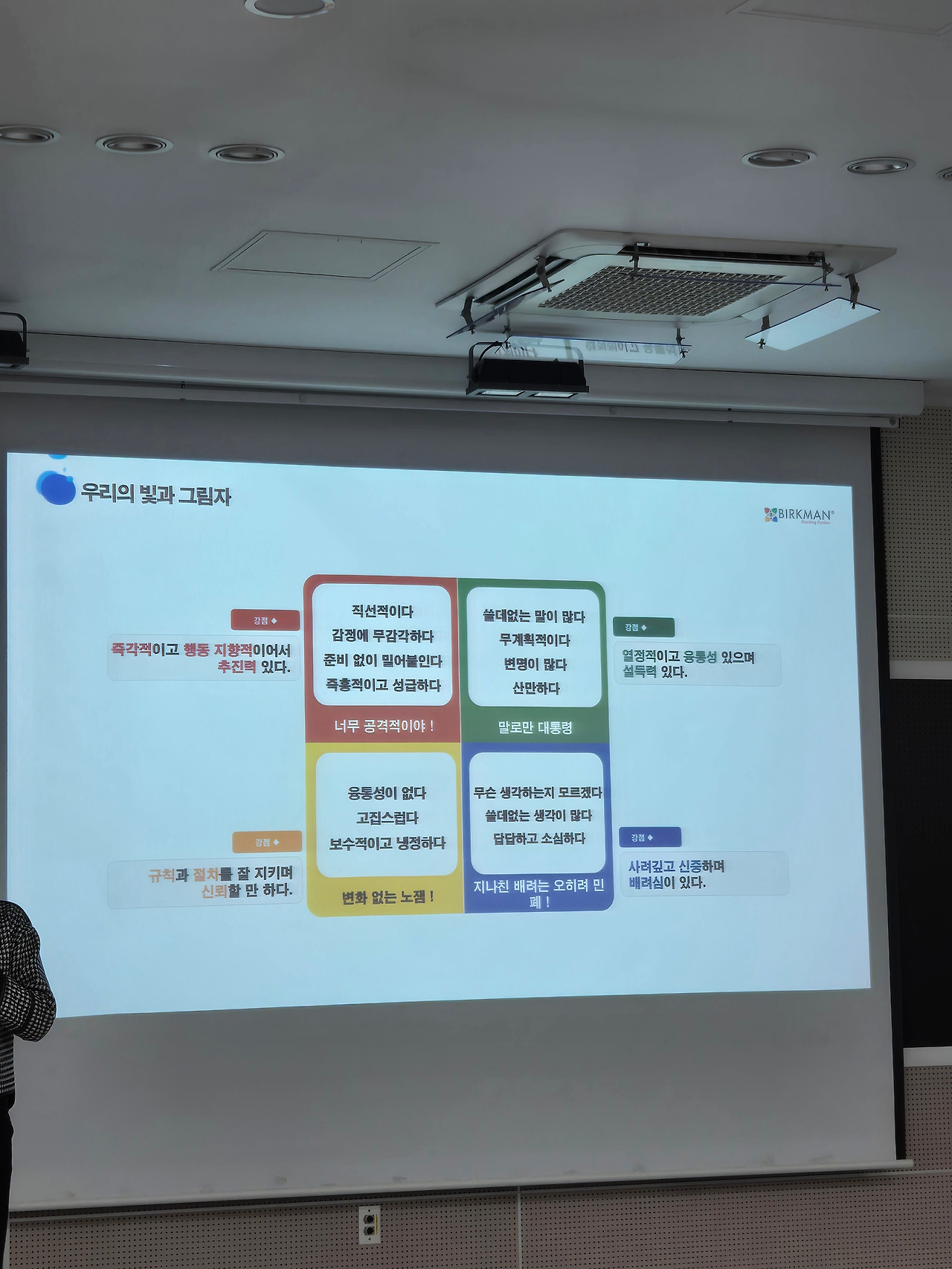 강연자는 개개인의 컬러별 기호가 크게 적힌 명함(마치 오징어 게임의 마크처럼)과 컬러별 막대그래프를 뽑아 나눠주었고, 모든 일원들의 컬러 기호 결과가 다 담겨있는 종이도 함께 주셨다. 요새 회사들이 돈을 그렇게 쏟아부으면서까지 이 검사를 하는 이유는 결국 회사는 일이 아닌, 사람이라는 중요성 때문이다. 나 또한 그 말에 공감을 한다. 그 사람이 바라는 게 무엇인지, 내가 바라는 걸 어떤 방식으로 전달해야 하는지, 그 사람은 어떨 때 스트레스를 받는 건지 등 자신의 대인관계와 업무 방식 등을 알아야 일터는 평화로울 것이라 장담한다. 일이 힘든 게 아니라 사람 때문에 힘이 들어 떠나는 경우가 허다하기 때문이다.