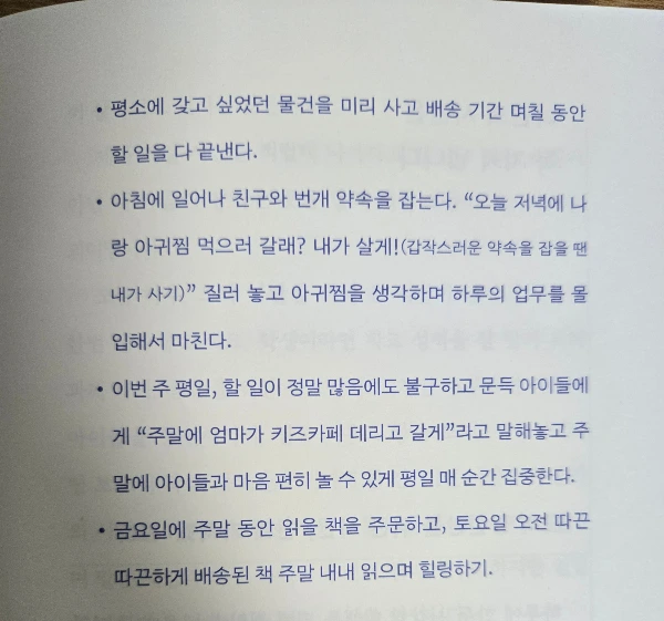 단순하게 생각해 보면, 한 달 안에 마쳐야 하는 일정과 그 주에 끝내야 하는 일들, 오늘 안에 한두 시간, 세네 시간 안에 끝낼 수 있는 업무나 짧은 일정 등을 말한다. 근데 여기서 이 작가는 즐거운 마감의 예시를 들었다. 정말 당장이라도 적용하고 싶을 만큼 재미있는 예시였다. 이런 예시가 더 많았길 바라는 마음이 들 정도다.