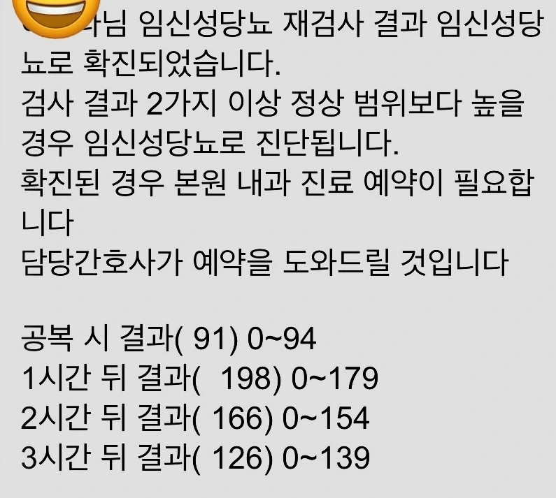 그리고 결과를 기다리는데, 두둥! 임당 재검 당첨이다. 사실 내가 먹덧을 한 것도 아니고 나름 적당량 혹은 소식하거나 출퇴근을 걸어서 하는데도 불구하고 재검이라니, 재검 당첨 문자를 받고 한동안 멍했다.