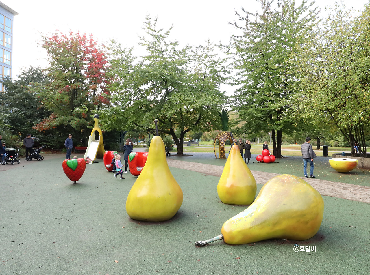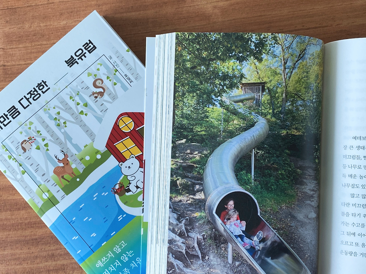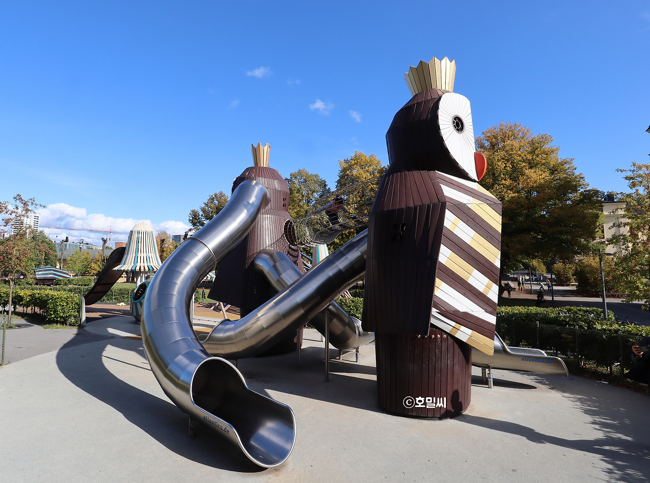 덴마크, 스웨덴, 핀란드를 비롯한 북유럽 여행을 하면서 나는 아이와 함께 창의놀이터를 부지런히 돌아다녔다. 사실 일부러 찾아갈 필요도 없는 것이, 숙소 근처이든 관광지이든 어딜 가든 다양한 창의놀이터가 넘쳐났다. 난파선부터 비행기 구조물, 거대 독수리나 부엉이, 곰 미끄럼틀, 딱정벌레, 고래, 버섯, 딸기, 바나나… 아이들이 상상할 수 있는 거의 모든 것들이 놀이기구로 만들어져 있었다. 요즘엔 우리나라의 신식 놀이터에서도 인기인 집라인이나 인라인스케이트장 시설도 잘돼 있고, 닭이나 양 같은 가축을 키우는 농장 놀이터도 있었다. 놀이터에는 심플하고 튼튼하게 만들어진 킥보드나 자전거가 누구나 사용할 수 있도록 무료로 비치돼 있어서 아이들이 개인 자전거나 킥보드를 타고 올 일도 없다. 어느 정도 규모가 있는 곳엔 오두막 모양의 휴게실도 딸려 있다. 휴게실 안엔 화장실, 수유실, 간단한 놀이기구가 갖춰진 실내 놀이실이 있어서 간식도 먹고 쉬었다 또 놀 수 있다.