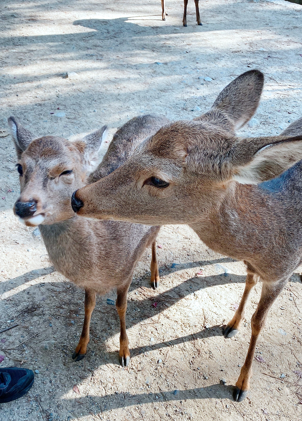 나라 공원의 사슴들은 지나가는 사람을 보면 따뜻하고 축축한 코를 남의 엉덩이에 갖다 대고는 능숙하게 잘도 밀어낸다.