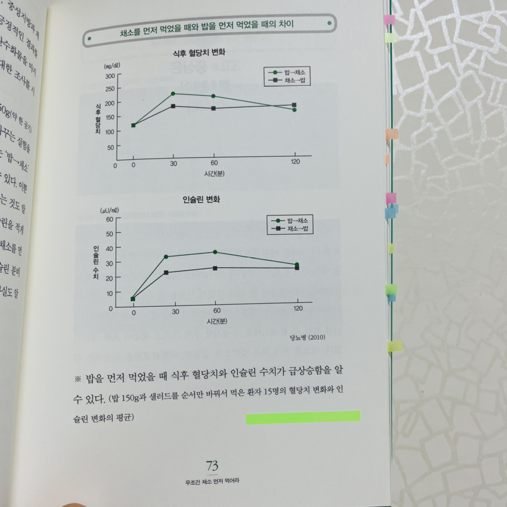 그때부터 영양 지도를 할 때 '채소를 가장 먼저 먹으라'고 한마디를 곁들였대요. 그러자 환자들의 혈당치, 중성지방, 체중이 줄어들기 시작했다는 거죠.