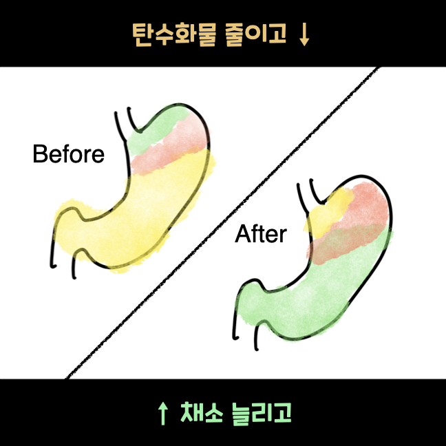 이렇게 하면 먹는 총량에서는 채소 섭취량이 늘어나고, 에너지 공급 차원에서는 지방과 단백질을 더 먹게 돼요.