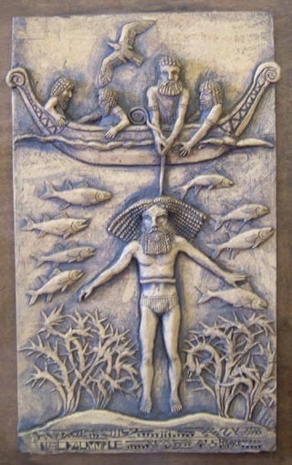 길가메시와 우르샤나비는 배에 올랐다. 배를 파도에 띄우고 다시 돌아가려 했다. 바로 그때, 우트나피쉬팀에게 아내는 말했다.