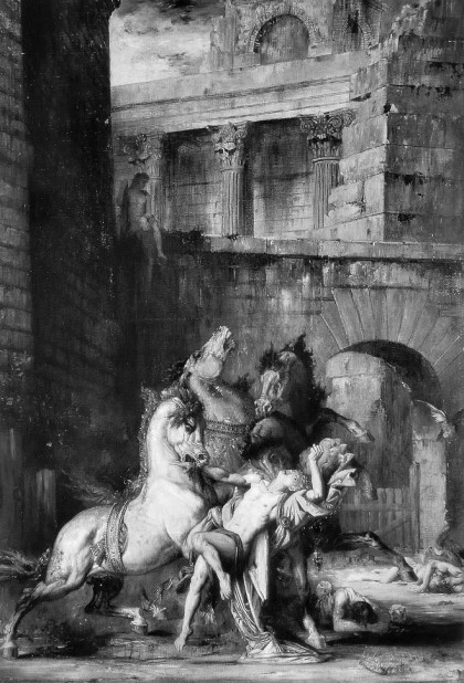 적어도 자기가 어떻게 될지 알았다면 차라리 그 말들을 곱게 보냈어야 했다. 헤라클레스는 아주 가볍게 본보기라도 되는 마냥 디오메데스를 죽였거든. 죽은 남자는 말이 없다. 말은 주인을 더 이상 알아보지 못한다. 미안하지만, 그냥 고깃덩이일 뿐이다. 헤라클레스는 살점이 조금 남은 뼈들을 뒤로하고 말들을 티린스로 데려왔다.