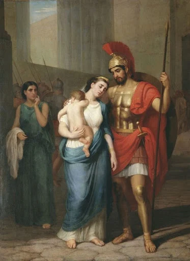 그 모습을 본 헥토르는 오랜만에 웃음을 터뜨렸다. 얼른 투구를 벗고 아이에게 키스를 퍼부었다. 하늘을 향해 아이를 번쩍 들고 아버지는 기도한다. “제우스여! 이 아이도 저와 같이 모든 트로이 인 중에서 가장 뛰어난 전사가 되게 해 주십시오. ‘아버지보다 훨씬 용감한(이때 잠시 헥토르는 말을 잇지 못했다.) 아들이구나!‘ 사람들이 말하게 하시고, 전쟁터에서 적들을 죽이고 전리품들을 가지고 돌아와 어머니를 기쁘게 해 줄 수 있도록 이 아이에게 복 내리소서!“ 그리고 어느새 고운 뺨을 눈물로 적시고 있는 여인을 향해 남자는 말했다. “사랑하는 안드로마케, 절망에 스스로를 던지지 마시오. 나를 죽음으로 내몰 수 있는 이는 없소. 하지만, 우리는 인간으로 태어났으니, 용감한 자이든, 겁쟁이든 운명을 피할 순 없지. 자, 당신은 집으로 돌아가 부녀자들에게 주어진 일을 하시오. 전쟁은 트로이의 모든 남자들, 그리고 남자 중의 남자. 이 몸 헥토르가 해야 할 일이라오.“ 다시 투구를 집어 들자, 헥토르의 아내 안드로마케는 집으로 향했다. 몇 번이나 다시 돌아보며 여인은 눈물을 쏟았다. 하녀들과 함께 헥토르의 죽음을 애도했다. 산 자를 위해 애도한다는 것은 다소 소름 끼치는 일이 아닐 수 없으나, 그만큼 그의 운명은 뻔했던 것이다.