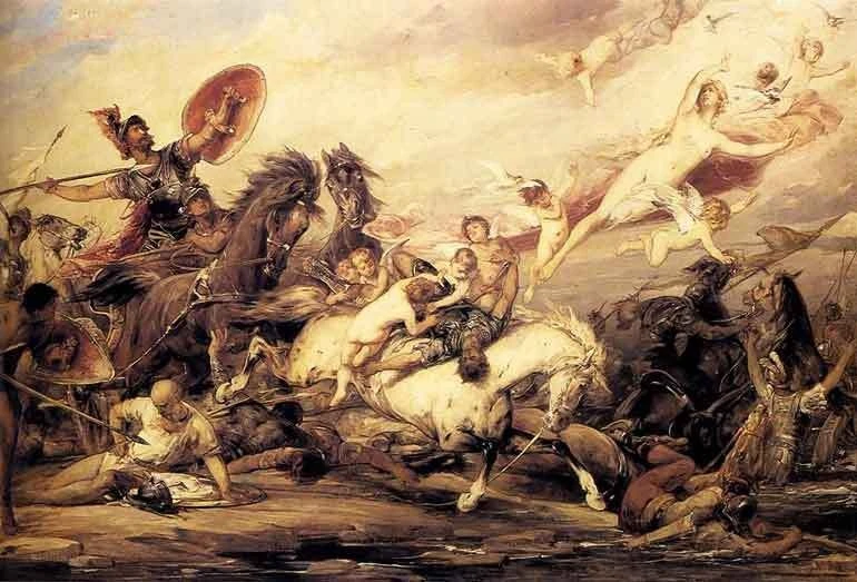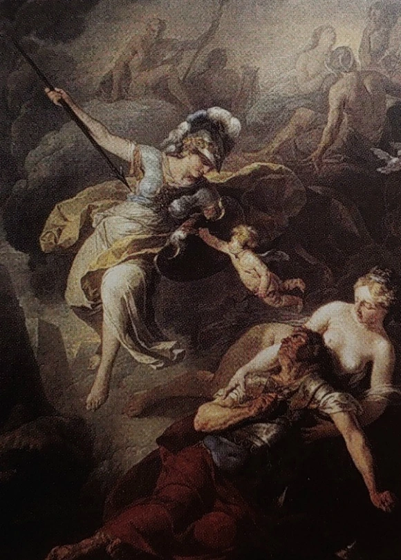 동시에 디오메데스는 장정 두 명은 와야 해결할 수 있을 것 같은 큰 바위를 혼자서 번쩍 들어 올렸다. 그리고 그 바위는 아이네이아스의 허리를 향해 날아갔다. “크흑!“ 아무리 위대한 전사였다지만, 그 큰 바위를 견디긴 무리였다. 세상이 순간 캄캄해졌을 때, 미의 여신이 나타났다. 빛나는 아프로디테의 겉옷은 가련한 남자를 감쌌다. 여신은 사랑하는 아들을 데리고 전쟁터에서 빠져나갔다.(아이네이아스는 아프로디테의 아들이다.)