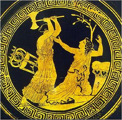 한 때 사랑했던 여인이 남편에게 칼을 꽂아 넣는다. 그것도 연거푸 두 번이나! 전쟁터에서 용맹함을 뽐냈던 와낙스도 어쩔 수 없었다. 그는 쓰러진다. 미끄러운 목욕탕 바닥이라 그랬는지, 아니면 이미 흥건한 피 때문이었는지 그는 다시 일어나지 못한다. 그때 다시 왕비는 한 번 더 칼을 꽂았다. 이렇게 개선하여 돌아온 바로 그 날, 아가멤논은 목욕탕에서 살해당했다.