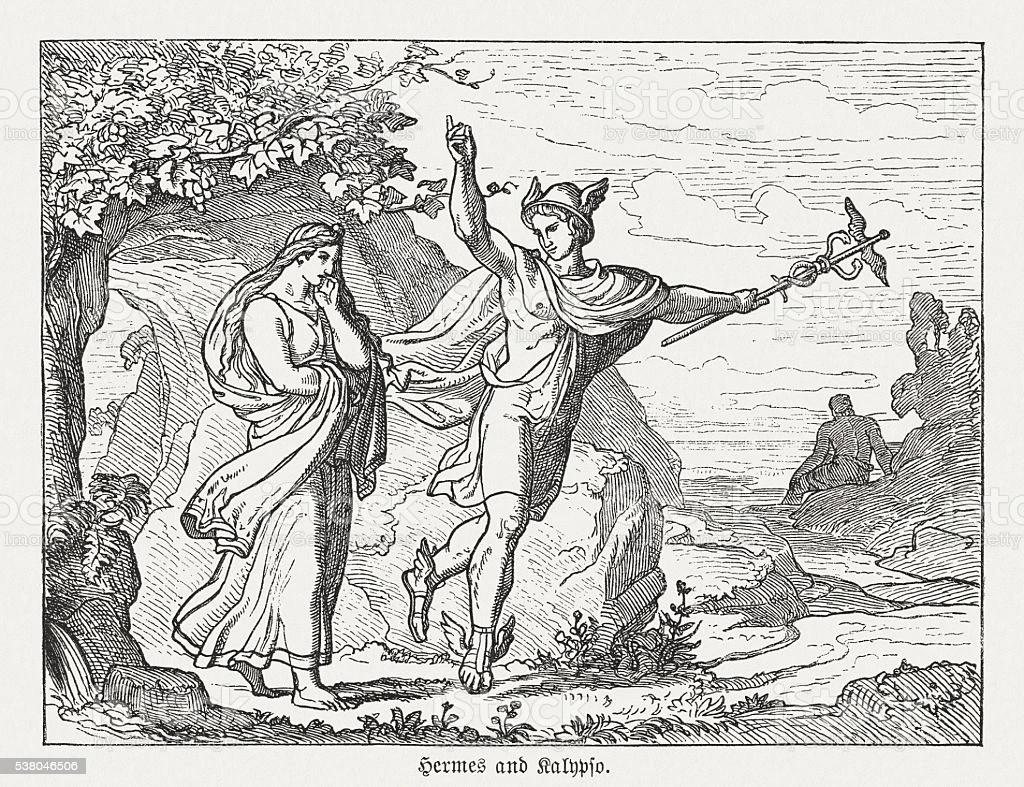 고귀한 요정 칼립소는 자기 거처에 방문한 헤르메스를 보고 반색했다. 그녀는 손님을 번쩍이는 안락의자에 앉히고 말했다. 암브로시아가 그득히 차려졌고, 불그레한 넥타르가 나왔다. 배가 고팠던 전령은 마음껏 먹고 마셨다. 음식으로 마음이 충분히 즐겁게 되자, 그녀에게 말했다.