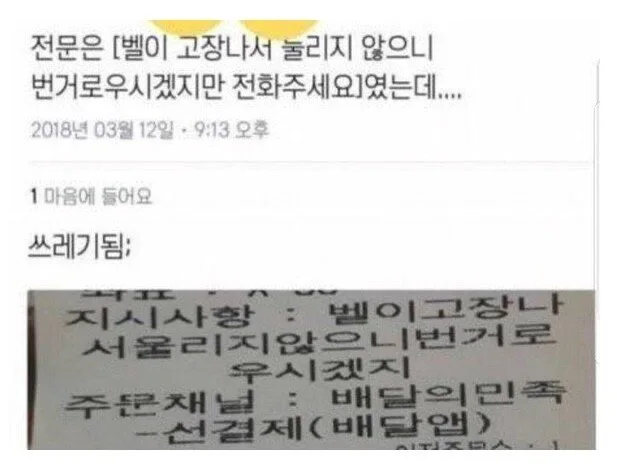 무슨 생각이 드는가? ‘아, 요즘 갑질이 유행이라더니 배달하면서 누가 갑질을 했구나?’ 생각한다면 오해다. 인터넷에서 소위 ‘웃음짤’로 많이 돌아다니는 이 문구는 배달 음식 영수증에 적혀 있는 요구사항인데, 원래 '벨이 고장 나 울리지 않으니 번거로우시겠지만~' 으로 이어지는 친절한 문구였다. 하지만 영수증에 나오는 문구는 글자 제한이 있었고, 하필 '번거로우시겠지'까지만 나온 게 문제였다.