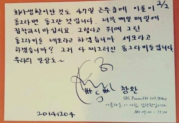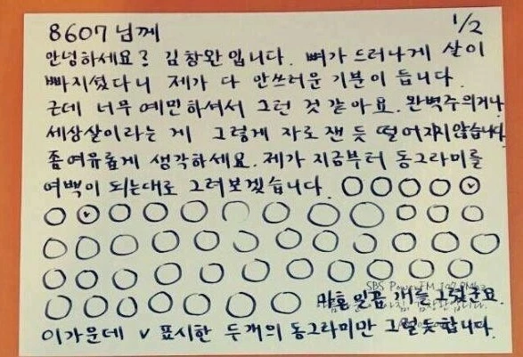 직접 듣지는 않았지만, 인터넷에서 보았던 김창완님의 이야기 한 토막이다. SBS 라디오 ‘아름다운 이 아침 김창완입니다’ 를 진행하는 그에게 '직장 생활로 스트레스를 받아 살이 쭉쭉 빠져요' 라는 내용의 사연이 도착했다. 그는 손편지에 동그라미를 잔뜩 그려 넣었다고 한다. 그렇게 하고 나서 다음과 같은 이야기를 적었다.