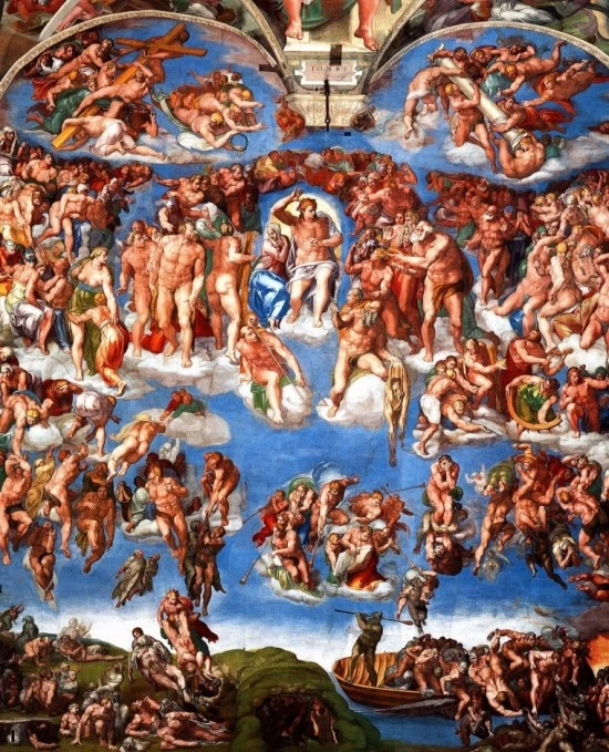 <최후의 심판>은 <천지창조> 이후 약 20여 년 후에 그려진 벽화로 세상의 끝에 인간을 심판하러 온 예수 그리스도의 모습을 담고 있는 그림입니다.