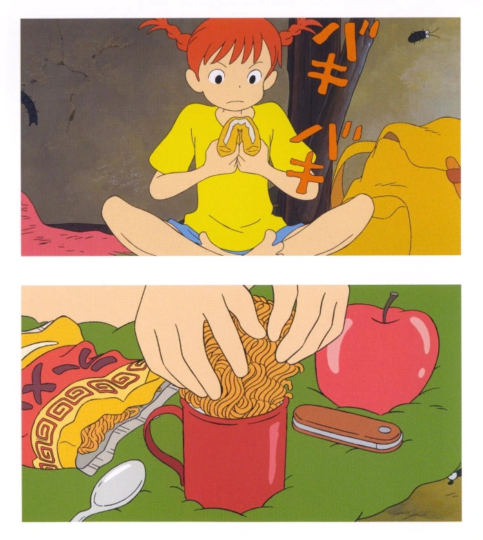 새로운 집을 찾아 여행을 떠나는 내용의 이 애니메이션은 재미있는 실험들이 잔뜩 시도된 작품입니다. 마치 만화책에서나 볼 수 있을법한 의성어 의태어 등의 표현이 그대로 작품 화면 안에 표현되었고, 작품 속의 효과음들은 전부 사람의 입으로 내는 등이었지요. 이 작품에서 사람이 효과음을 직접 내는 것은 이후 미야자키 하야오 감독의 마지막 작품 <바람이 분다>에서도 시도되었지요.