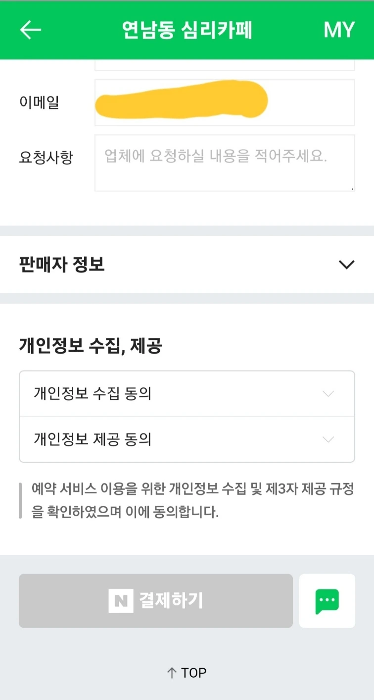 원래는 신청 메뉴 옵션이 나오고, 그것을 클릭하면 결제하기가 연두색으로 나와 결제하기를 클릭하면 예약이 된답니다. 커플 메뉴를 예를 들면, 이렇게요.