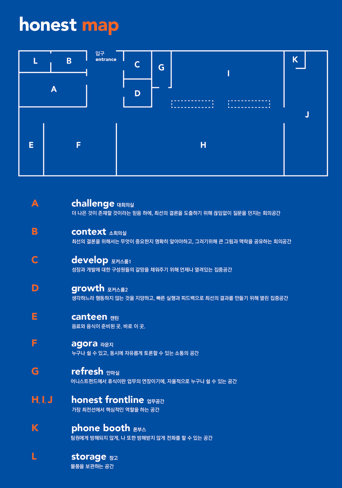 우리는 이곳에서 생산적 논쟁을 하고, 맥락을 공유하고, 그러한 과정을 통한 자기계발을 이뤄내고, 적절한 휴식을 취한다. 이 과정에서 성장한 개인은 결국 회사의 발전으로 이어지게 된다. 이렇든 우리는 한정된 공간에서 우리의 이야기를 담아내려고 노력하였다.