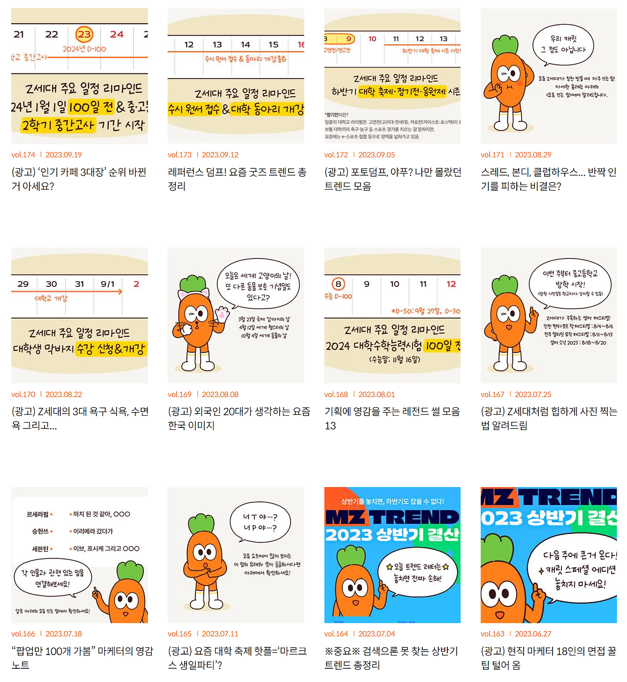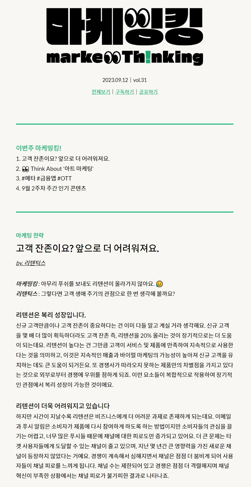 주차별로 인기 콘텐츠는 물론 마케팅 실무를 하며 어려웠던 또는 공감할 수 있는 업무 주제로 뉴스레터를 발송해 준다. 수박 겉핥기 식이 아니라 꽤 디테일한 분석들로 채워져 마케팅 배경지식 쌓기에 좋고 요즘 마케팅 산업 동향을 파악할 수 있다.