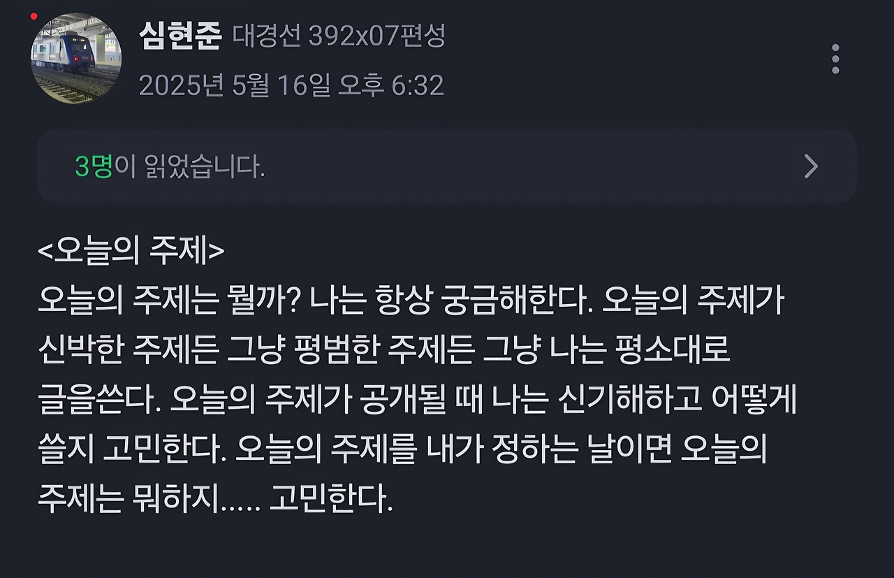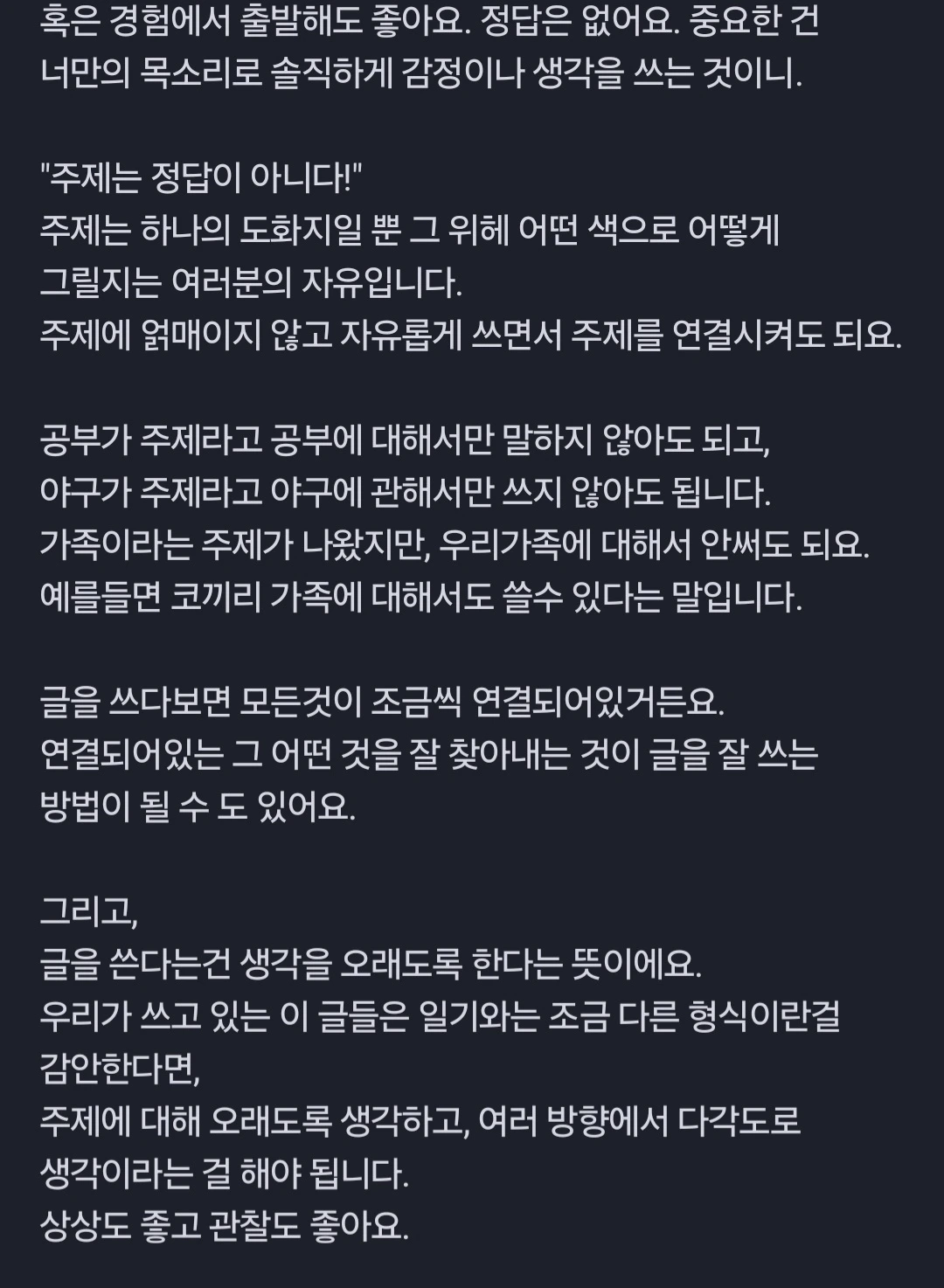 사진으로 남겨둔 아이들의 글을 다시 들여다보면, 그 변화가 더 또렷합니다. 주제를 받아 쓰던 아이들이, 주제를 만들어야 하는 사람이 되었을 때의 얼굴. 정답이 없는 질문을 스스로 만들어야 한다는 사실 앞에서 아이들은 예상보다 훨씬 오래 머물렀습니다. 무엇을 쓰느냐보다, 무엇을 말하고 싶은지를 고민하기 시작했기 때문이죠.
