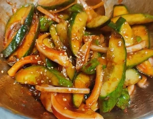 냉장고 문을 열고 방울토마토며 양상추 등을 찾아보았는데 채소라고는 양파밖에 없다. 먼저 냉장고를 살펴보고 장 보러 다녀왔어야 했는데 말이다. 오이만 싸가야 하나. 오이와 당근은 같이 먹으면 영양소가 파괴된다는 이야기가 뒤늦게 생각나서 당근은 포기했기 때문이다. 그러나 오이도 시들시들한 게, 파격 세일을 한 이유가 있었다. 이대로 싸간다면 더 물러질 텐데... 나도 알록달록한 예쁜 채소 도시락을 싸서 SNS에도 올리고, 먹어도 보고 싶었는데, 상하기 직전의 오이로 뭘 어쩌라고. 그 순간 머릿속에 번뜩이는 아이디어가 떠올랐다. 코리안 스타일 샐러드를 만들면 되잖아! 이름하여, ‘오이무침’.