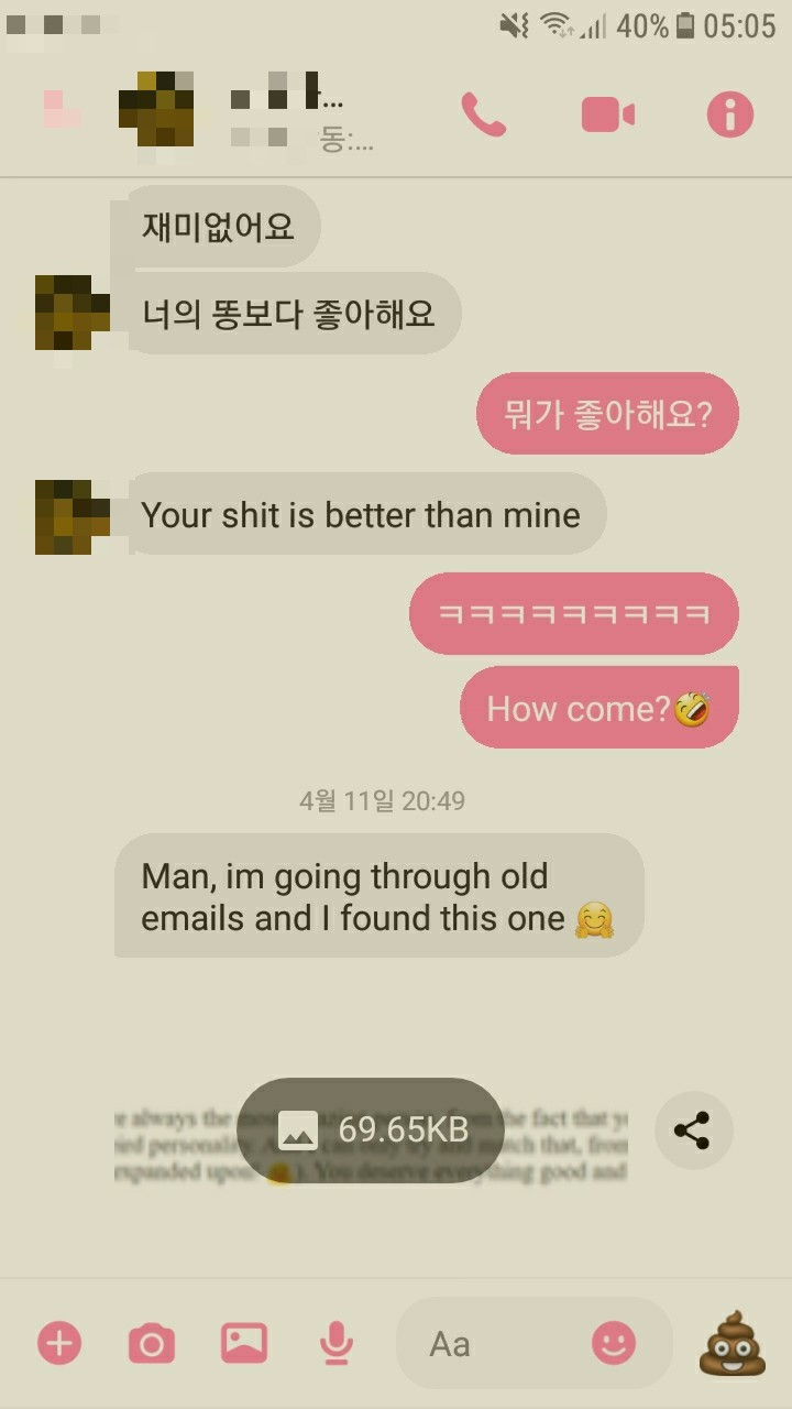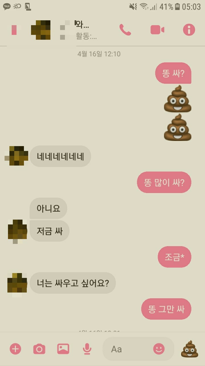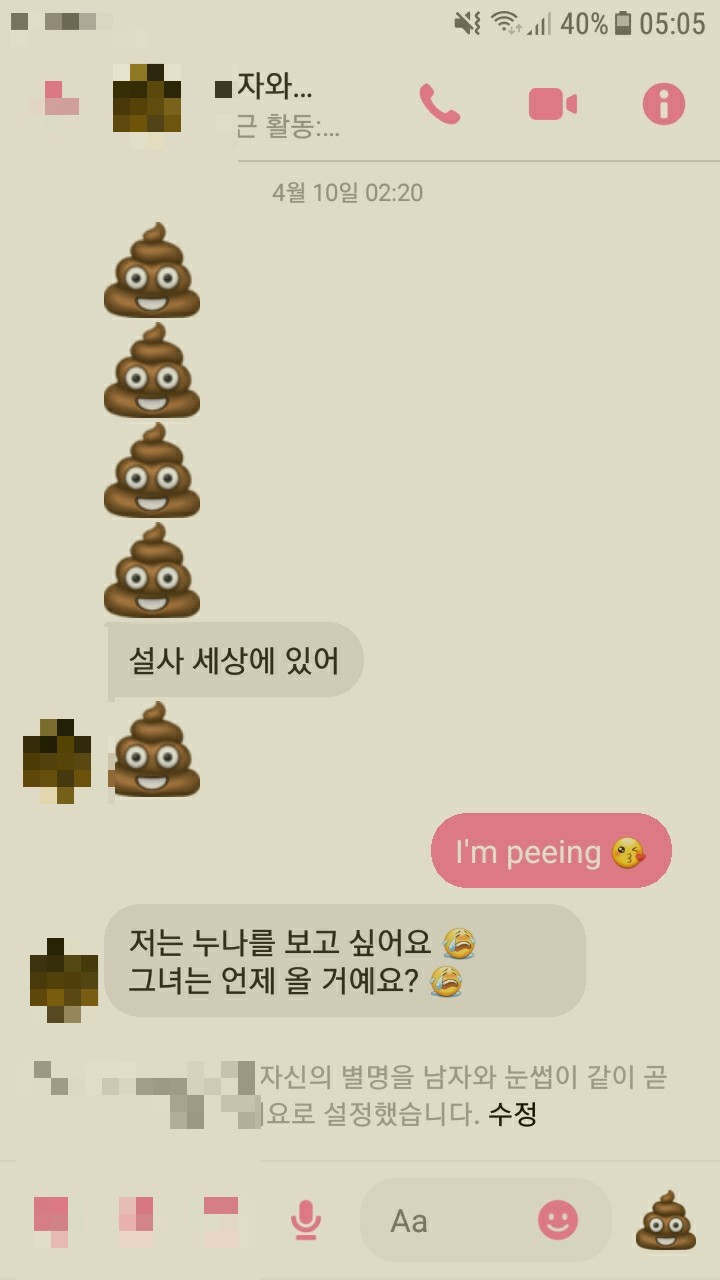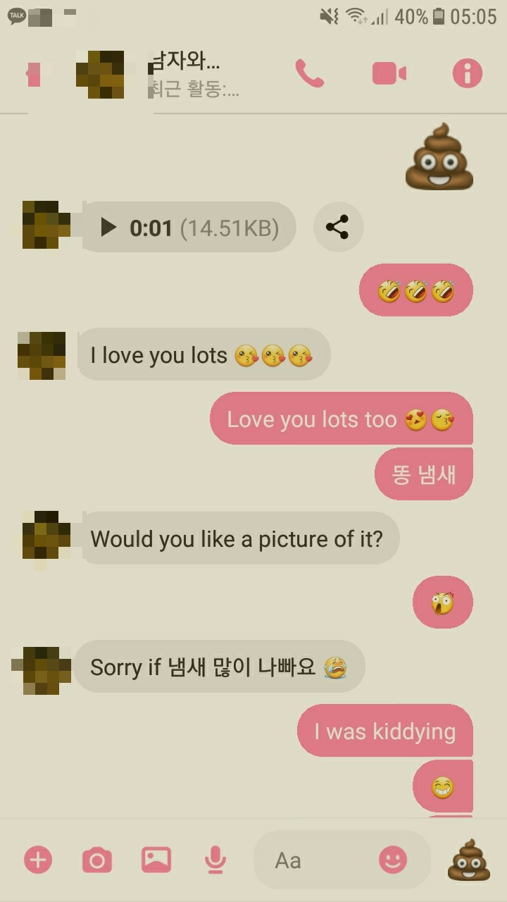 스펠링 오타는 무시 부탁 드립니다. 유치하고 더럽지만 우리는 한 사람이 화장실에 갈 때마다 메세지를 주고 받는다. 2. 인성이 괜찮은지