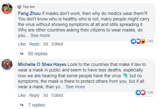 Fang Zhou 만약 마스크가 효과가 없다면 왜 의료진들은 마스크를 쓰지? 당신은 누가 건강한지 아닌지 모르고, 많은 사람들이 증상이 전혀 없이 바이러스를 가지고 퍼트리고 다니고 있는 중일 거다. 왜 다른 나라들은 국민들에게 마스크를 쓰라고 하며....... 더보기