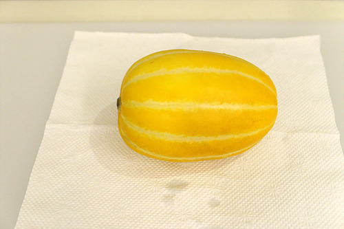 키친타올을 이용해 참외의 물기를 전부 닦아내고, 랩으로 감싸줍니다. 랩으로 하나씩 감싸는 것이 귀찮다면 지퍼백을 이용하는 방법으로 대체할 수 있습니다.