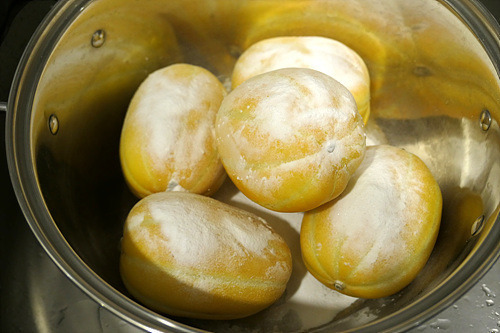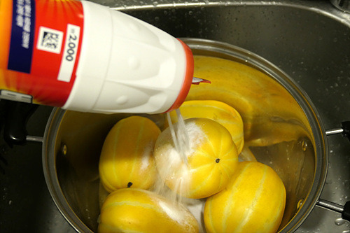 그리고 그 위에 베이킹소다를 뿌려준 후, 고무장갑을 끼고 참외 전체에 골고루 묻을 수 있도록 문질러줍니다.